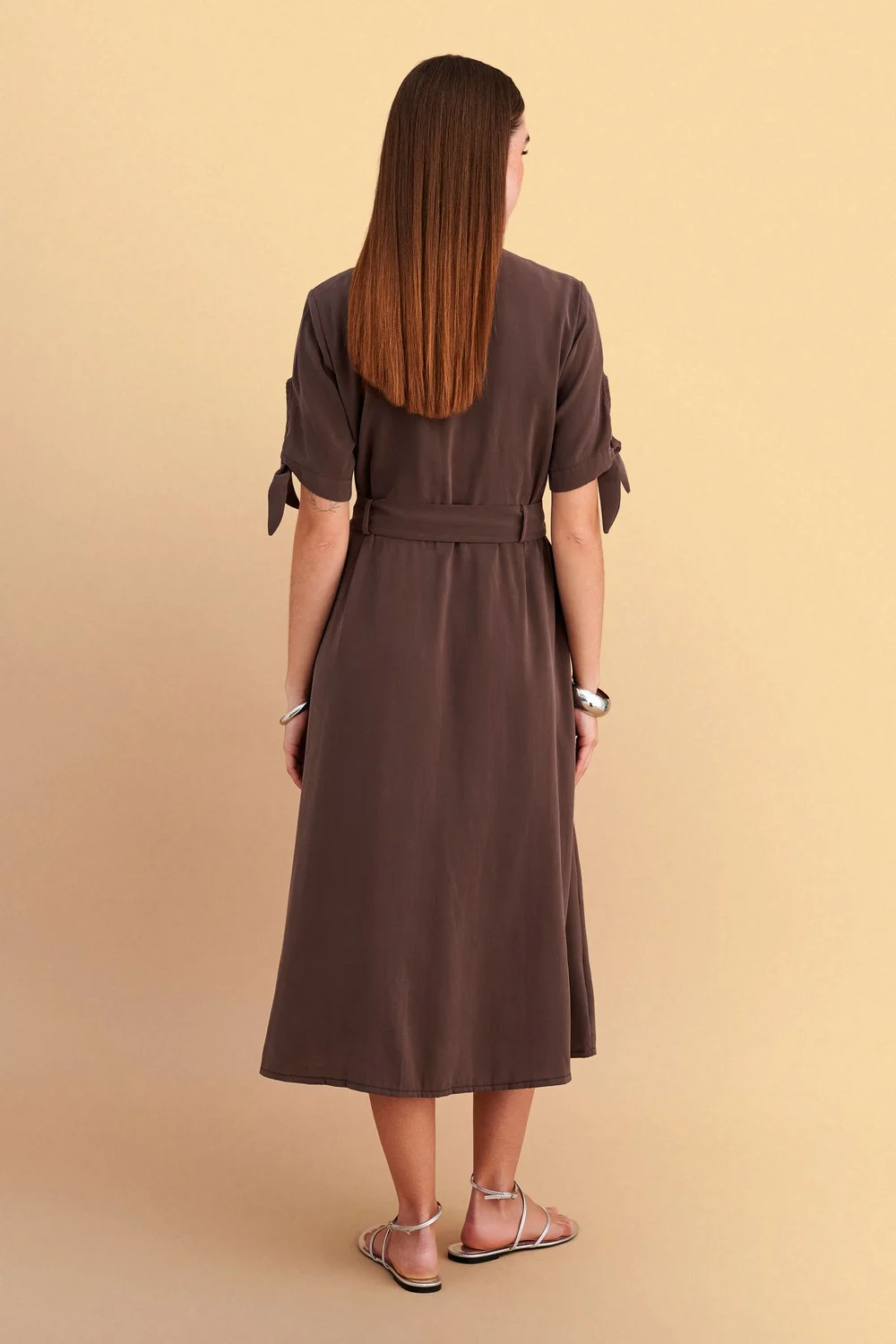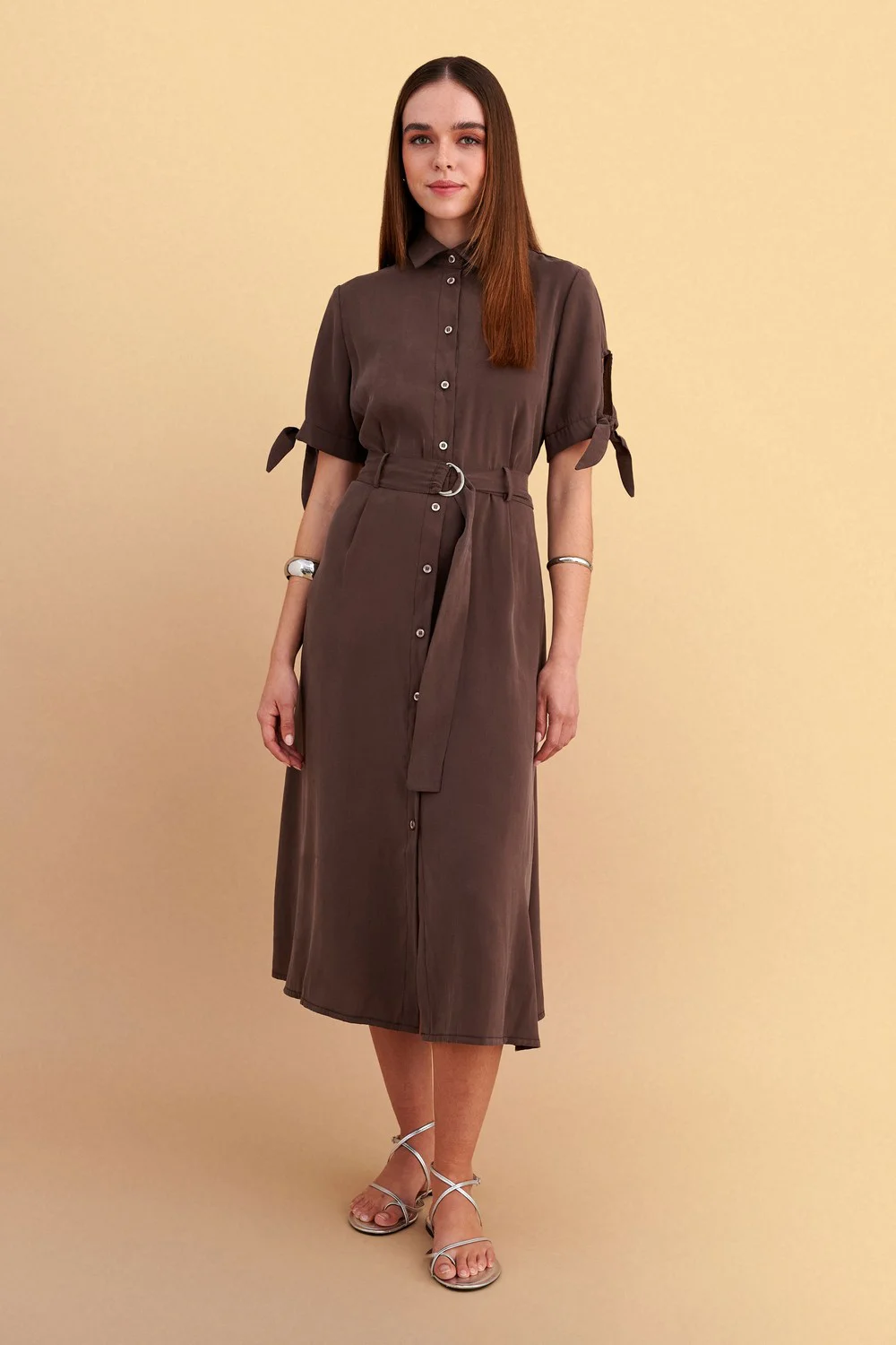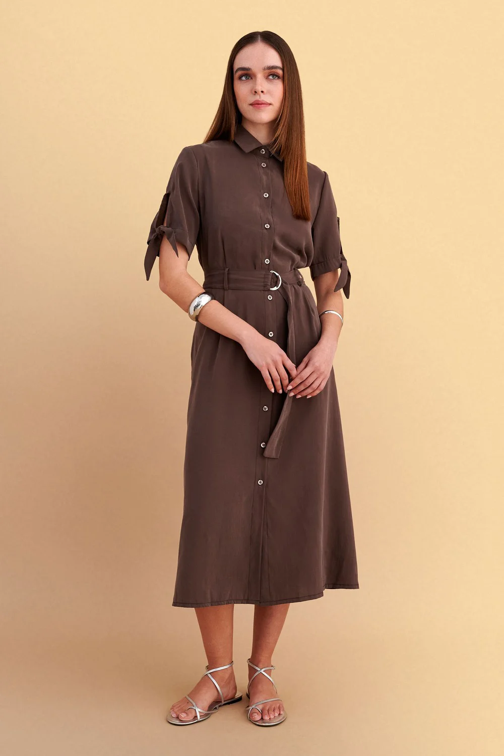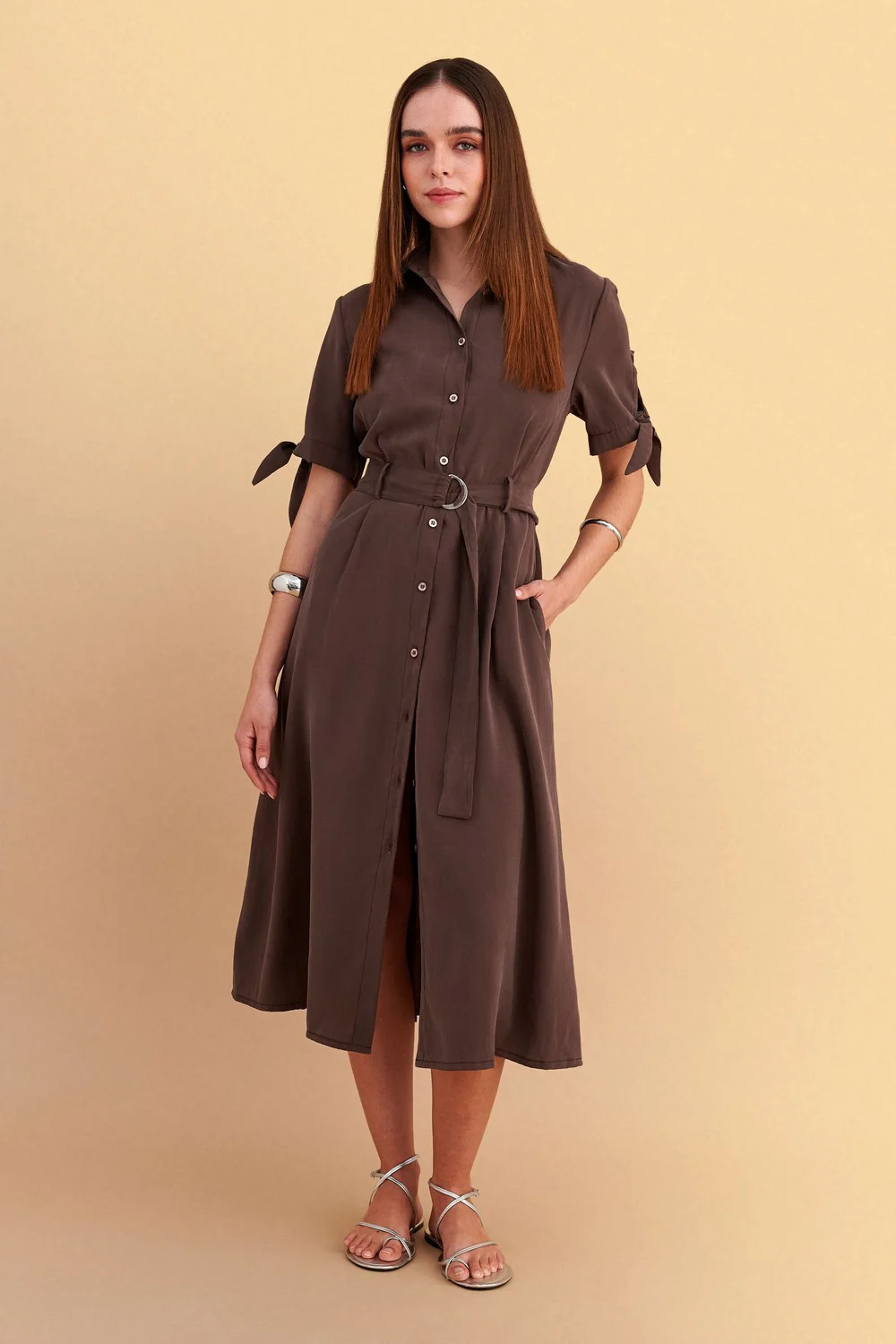Φόρεμα μίντι σε καφέ απόχρωση με κουμπιά μπροστά, ζώνη στη μέση και δέσιμο στα μανίκια. Ένα κομψό και άνετο φόρεμα που αναδεικνύει τη σιλουέτα και προσφέρει μοντέρνα εμφάνιση για όλες τις ώρες. Ιδανικό για καθημερινή χρήση και πιο επίσημες περιστάσεις