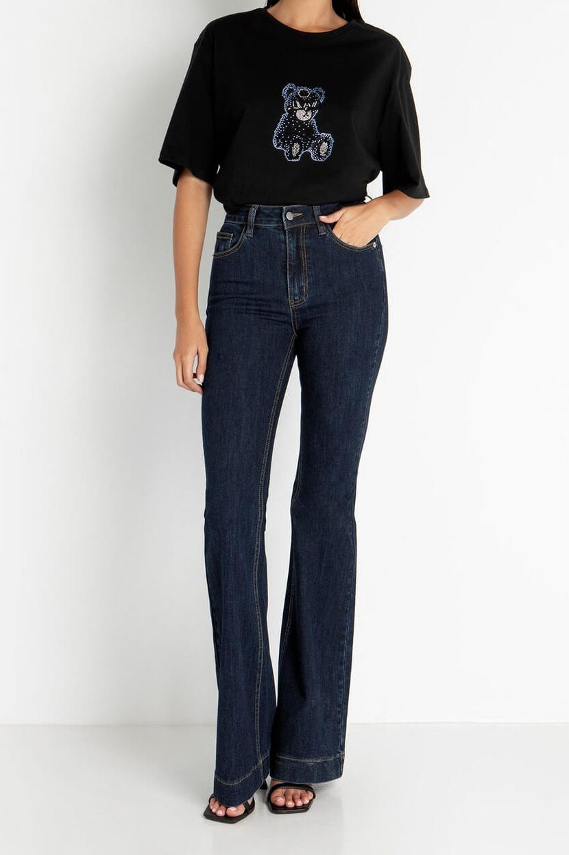 Ψηλόμεσο denim παντελόνι με 5-τσεπο σχέδιο & εβαζέ γραμμή στο κάτω μέρος. Λεπτομέρεια τονισμένα γαζιά. Κλείσιμο μπροστά με μεταλλικό κουμπί & φερμουάρ.
