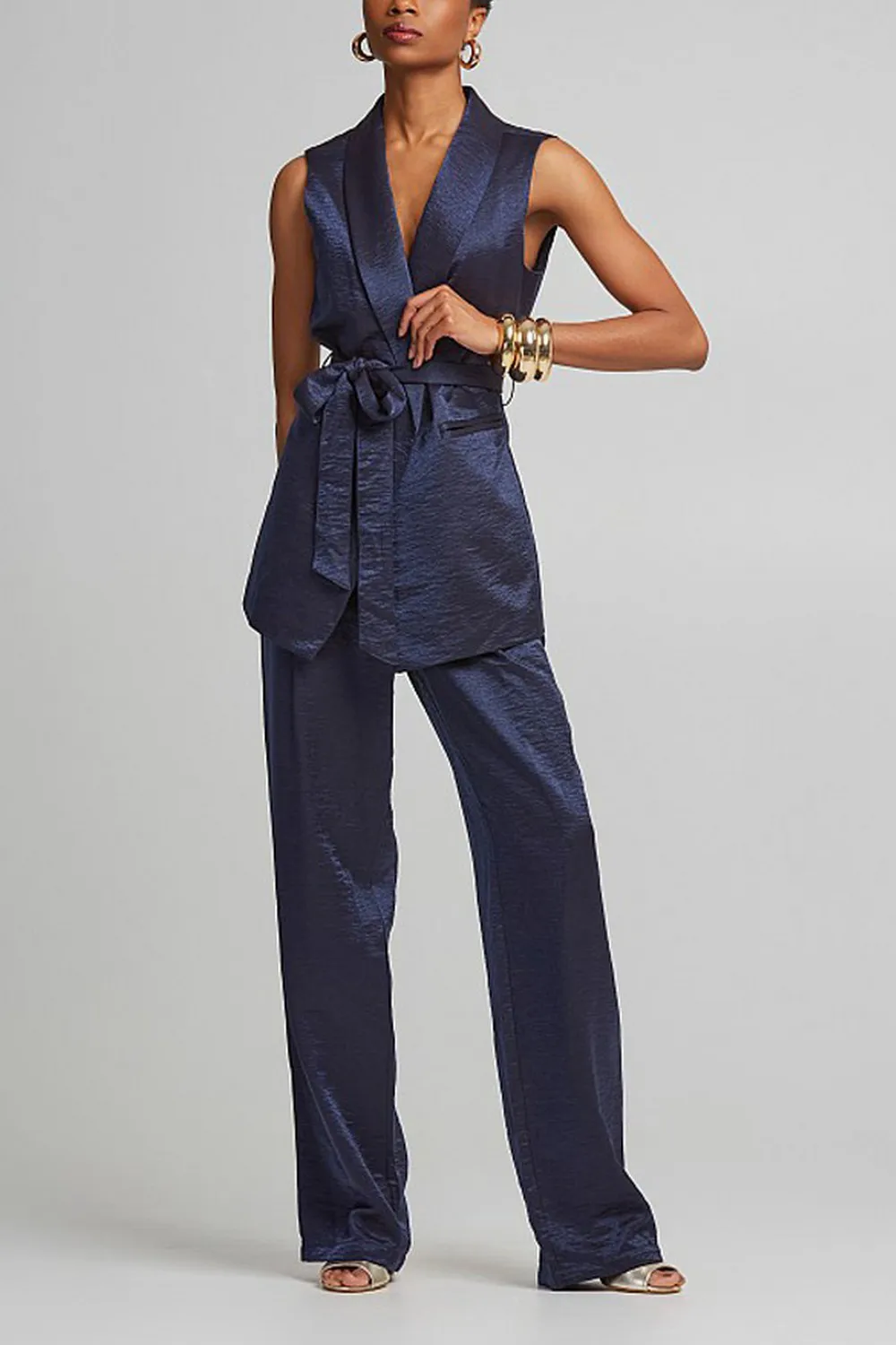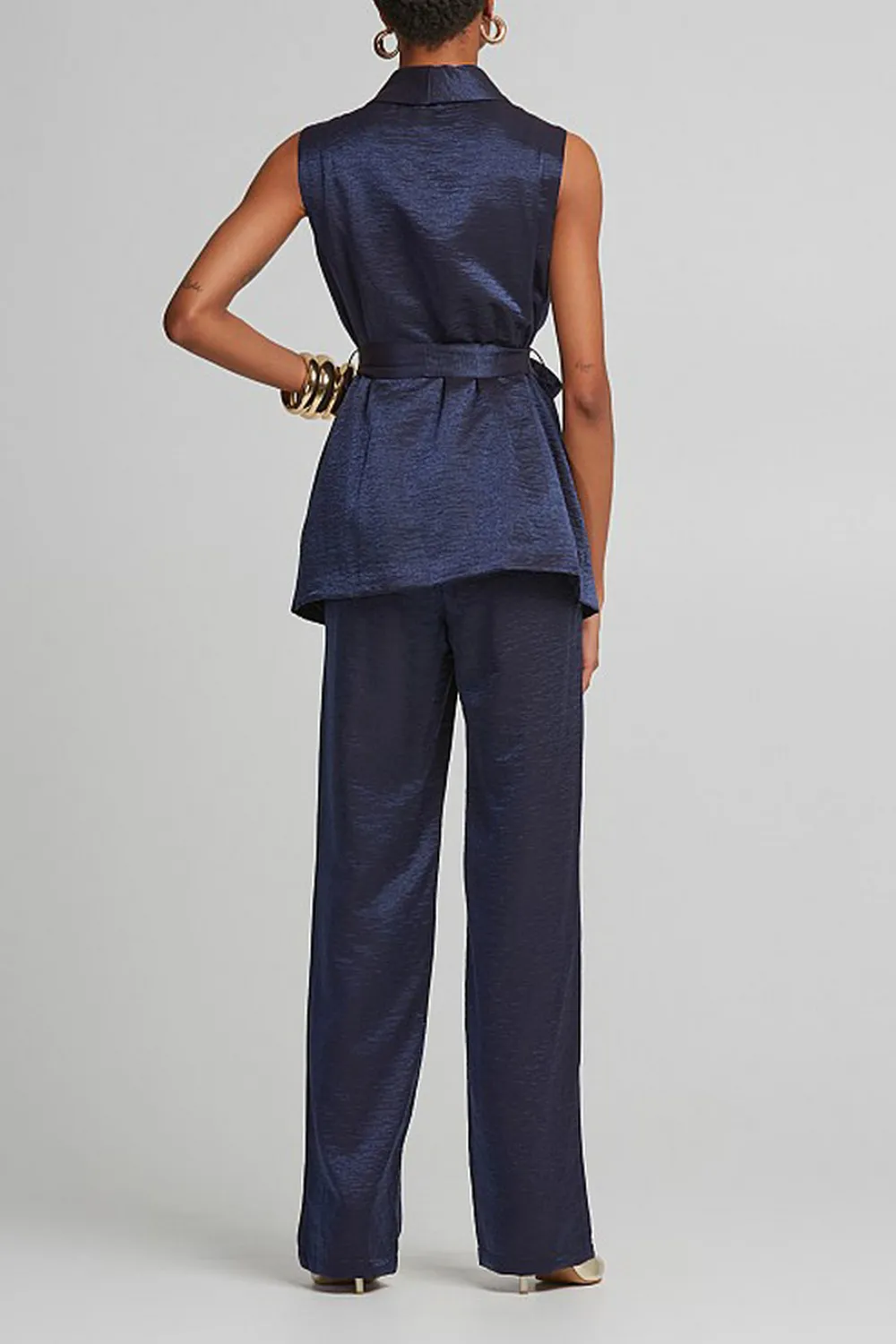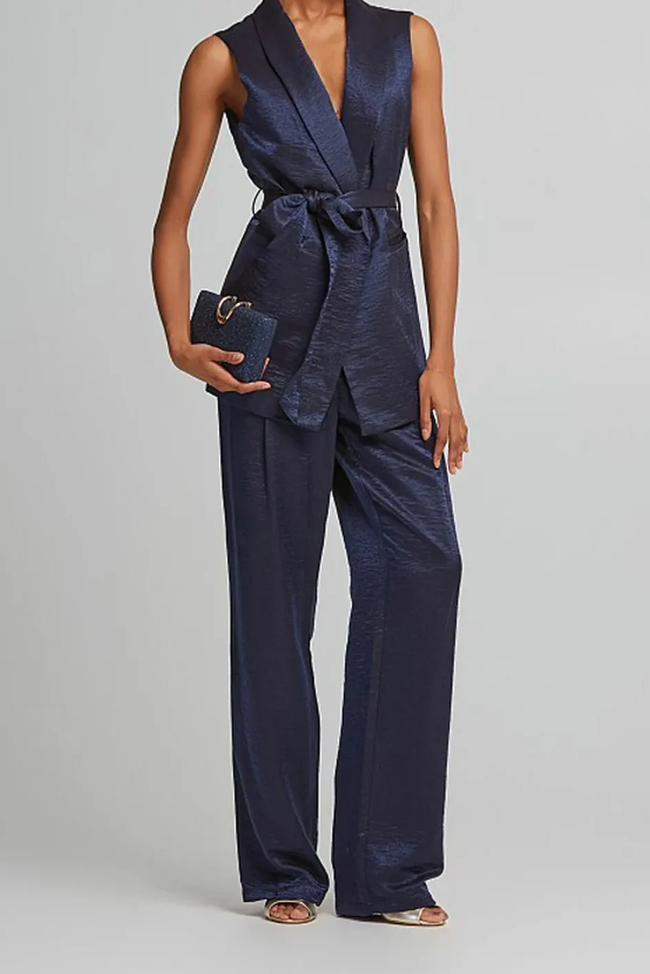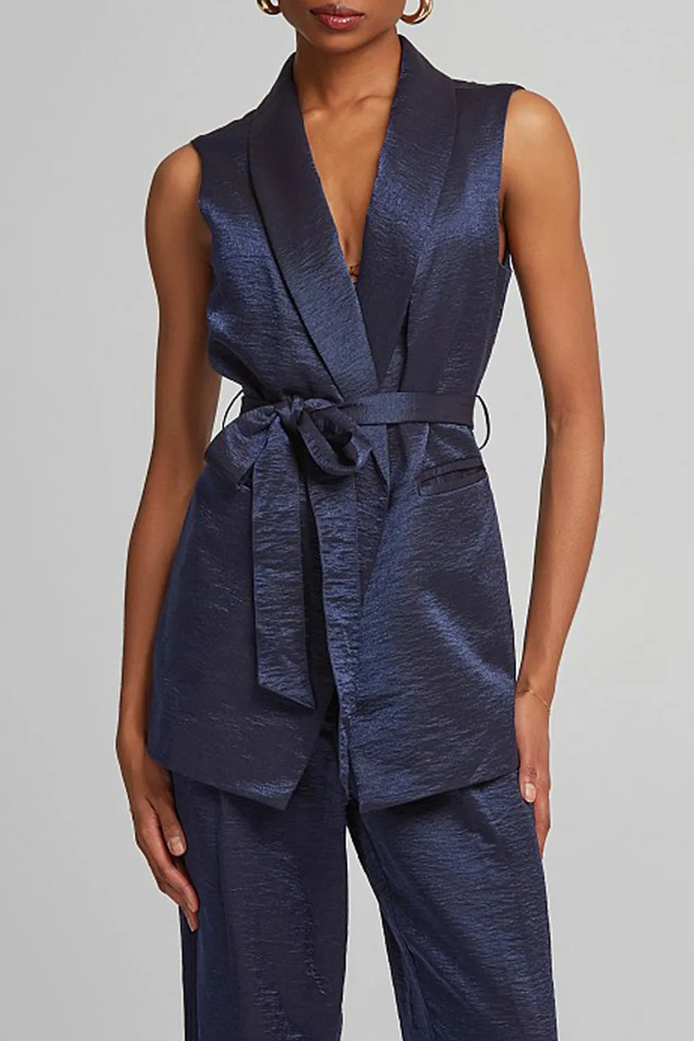 - Μεταλλιζέ γιλέκο με V λαιμόκοψη, αποσπώμενη ζώνη και τσέπες