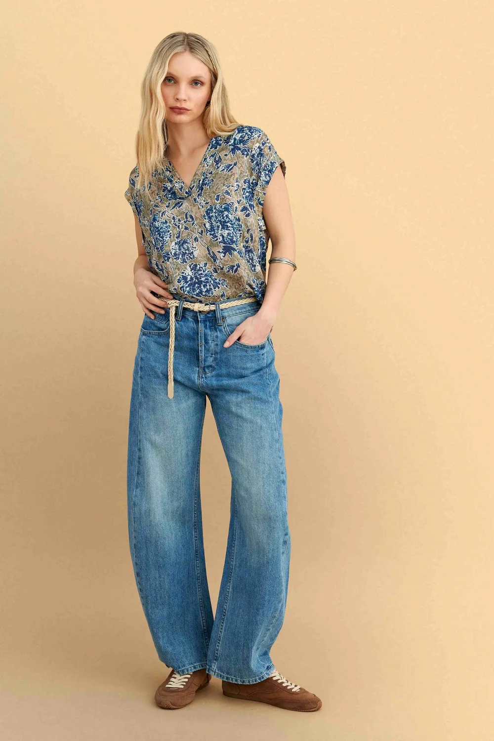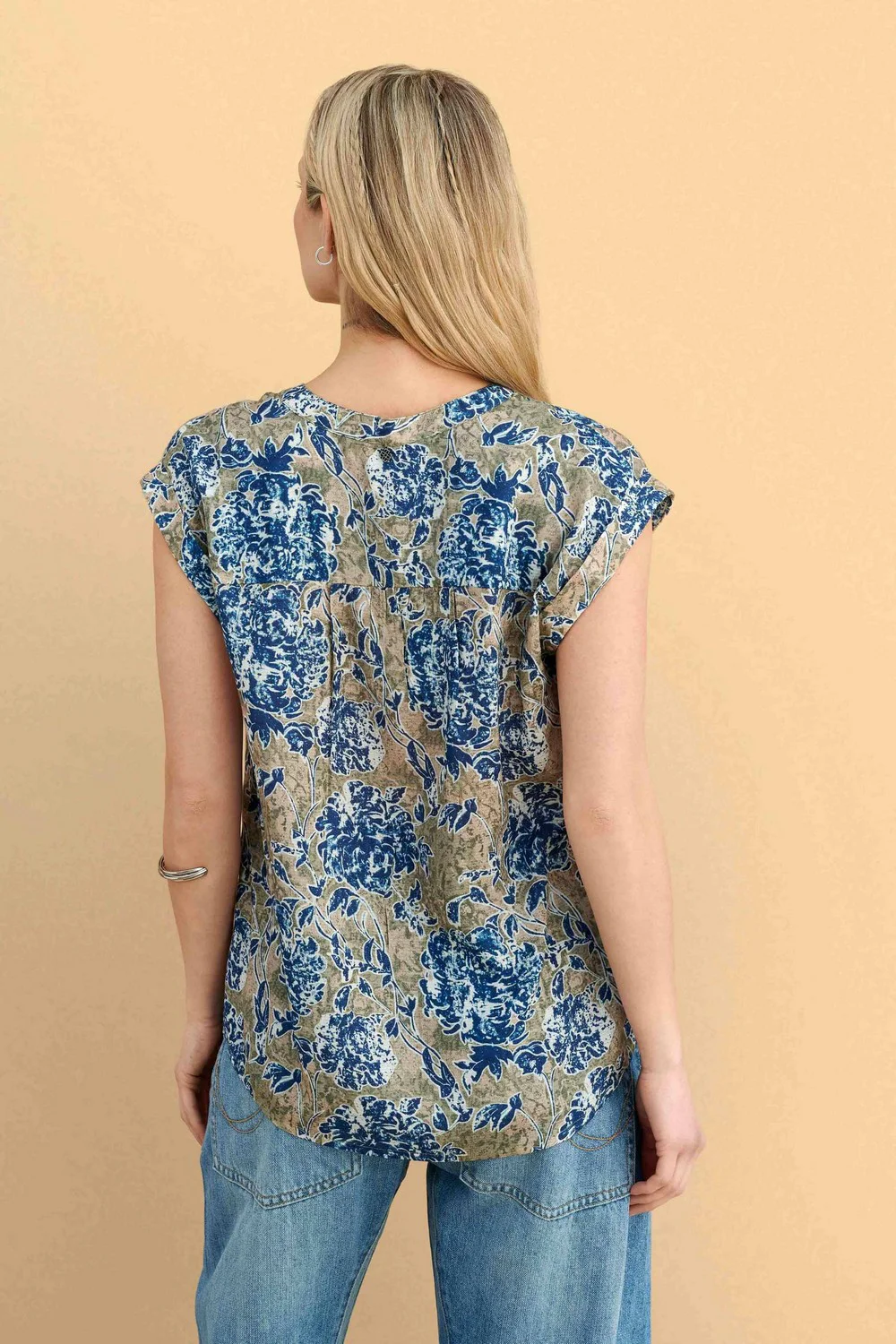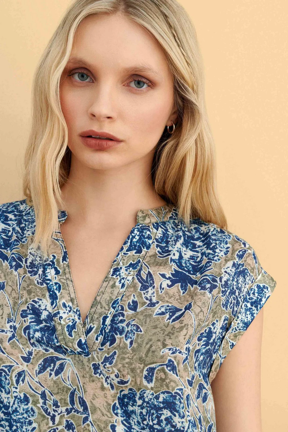 Μπλούζα εμπριμέ με κοντό μανίκι σε μποέμ στυλ, με γήινες αποχρώσεις και μπλε floral σχέδιο. Ιδανική για casual εμφανίσεις με άνετη εφαρμογή και ελαφρύ ύφασμα που προσφέρει δροσιά τους ζεστούς μήνες. Συνδυάζεται άψογα με τζιν παντελόνια για effortless chic look.