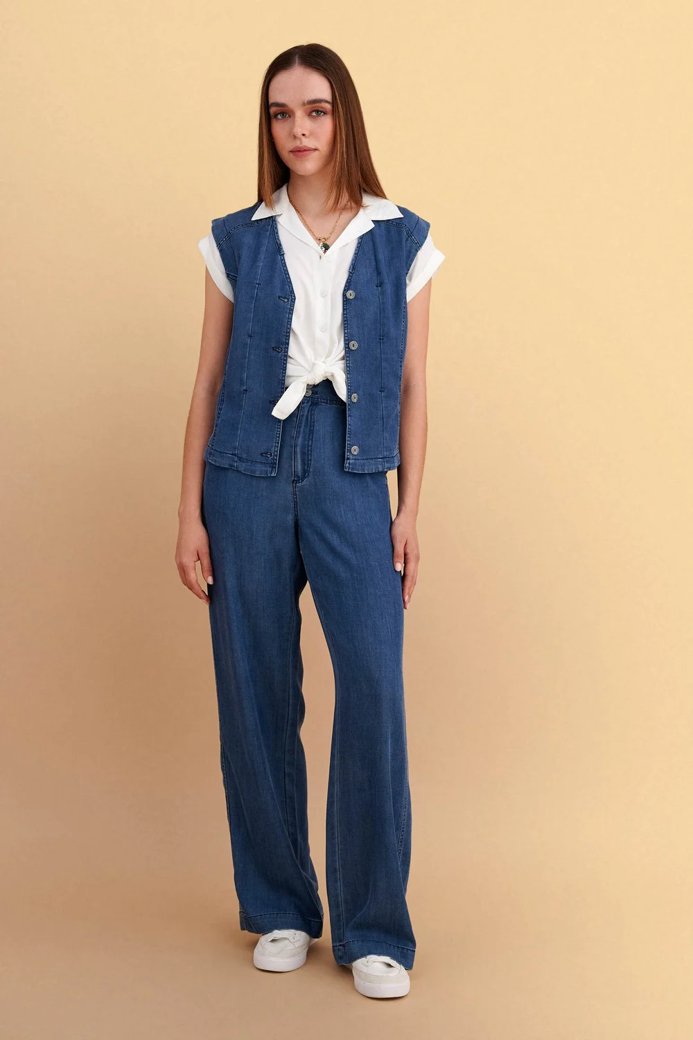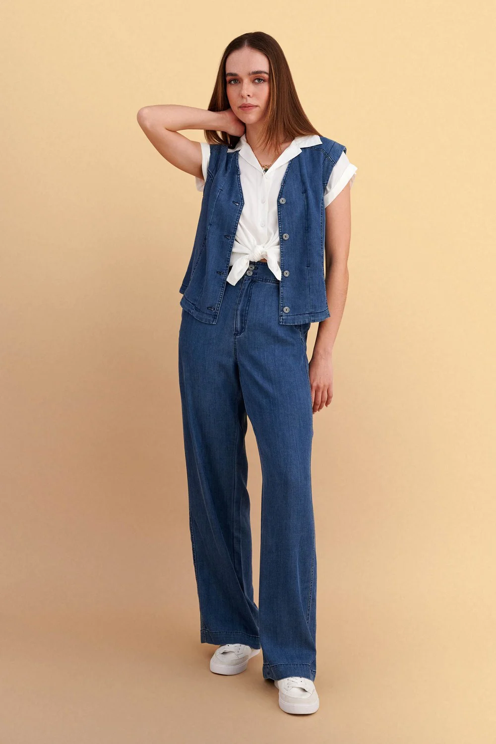 Γυναικείο παντελόνι denim με ίσια γραμμή, σε μπλε χρώμα. Ιδανικό για casual εμφανίσεις, συνδυάζει άνεση και κομψότητα. Το παντελόνι διαθέτει κανονική μέση και ευρύχωρα μπατζάκια για άνετη εφαρμογή.